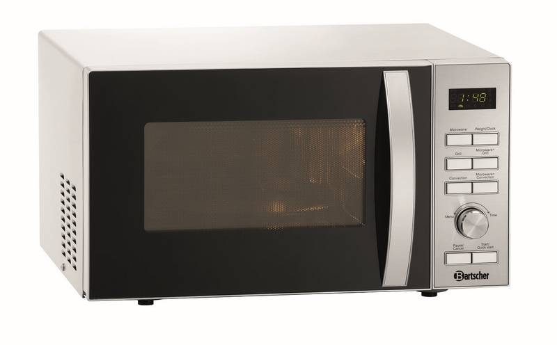 Rotary plate: Material: Glass Ø 270 mm Power load: 1,95 kW | 230 V | 50 Hz Time setting to: 95 minute(s) Material cooking chamber:Stainless steel Content: 25 litre(s) Size inside: W 316 x D 315 x H 197 mm Grill output: 1950 W Interior lighting: Yes Settable programs: 8 Number of output levels: 6 Functions: Defrosting, Heating ,Grill ( can be combined) Hot air (can be combined) Timer: yes Including: 1 grill pan, Ø 280 mm, height 52 mm Microwave output: 900 W.