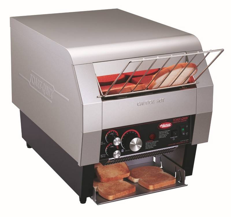 Belt toaster made entirely of stainless steel, ideal for buffet breakfasts.