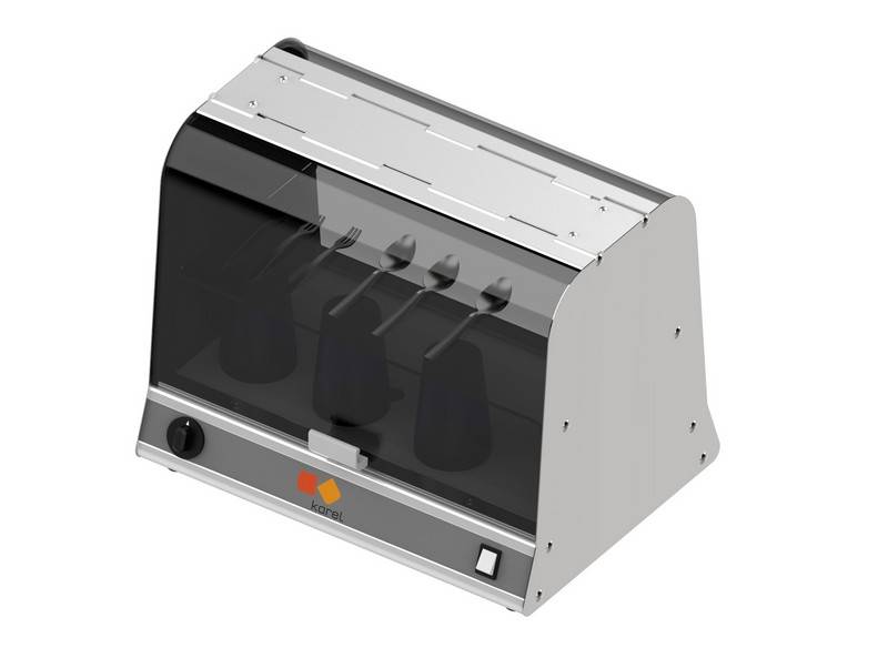 Allows you to sterilize glasses, cutlery or various accessories without having to turn them UV mercury vapor lamps with metal mesh protection.