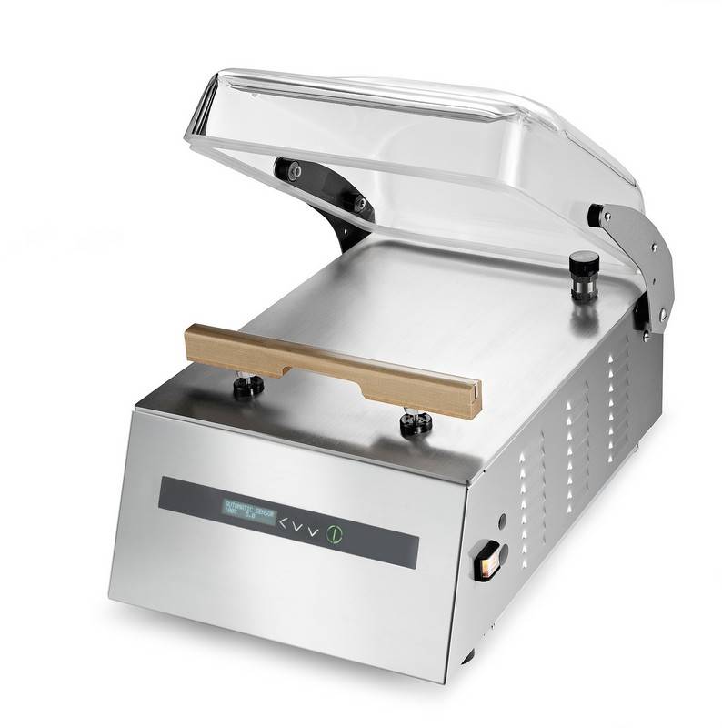 Extraordinary design reduces the footprint of the machine and improves comfort - Bell in great development of volume injection in Tritan - Easily removable sealing bar - Extremely easy to clean thanks to the perfect flatness of the support product plan made on AISI 304 stainless steel 5 mm thick - Automatic lifting the lid by means of pneumatic pistons - Surface for liquid bags - Easy and intuitive touch controls - 10 Programs that can be stored by the user - Marinating program - External vacuum program - Cycle counter - Not available with printer or gas flush - Automatic lid lifting by means of pneumatic pistons.