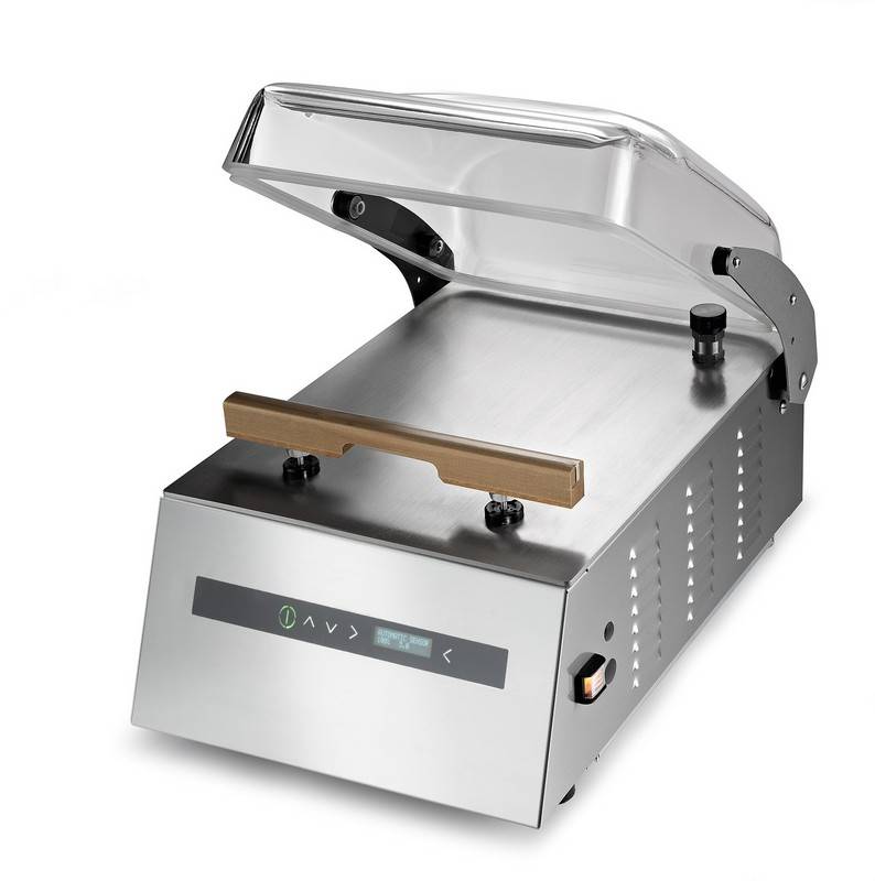 30 and 40 Easily removable sealing bar Extremely easy to clean thanks to the perfect flatness of the support product plan made on AISI 304 stainless steel 5 mm thick Automatic lifting the lid by means of pneumatic pistons Surface for liquid bags Practical and intuitive touch screen display Electronic control system with pressure sensor for fast and precise processing Adjustable automatic vacuum percentage: 50-100% Dedicated programme for liquids Dedicated programme for marinading 10 different settings savable to preference 6 selectable languages Settable sealing, vacuum and gas time on a scale 1-10 sec.
